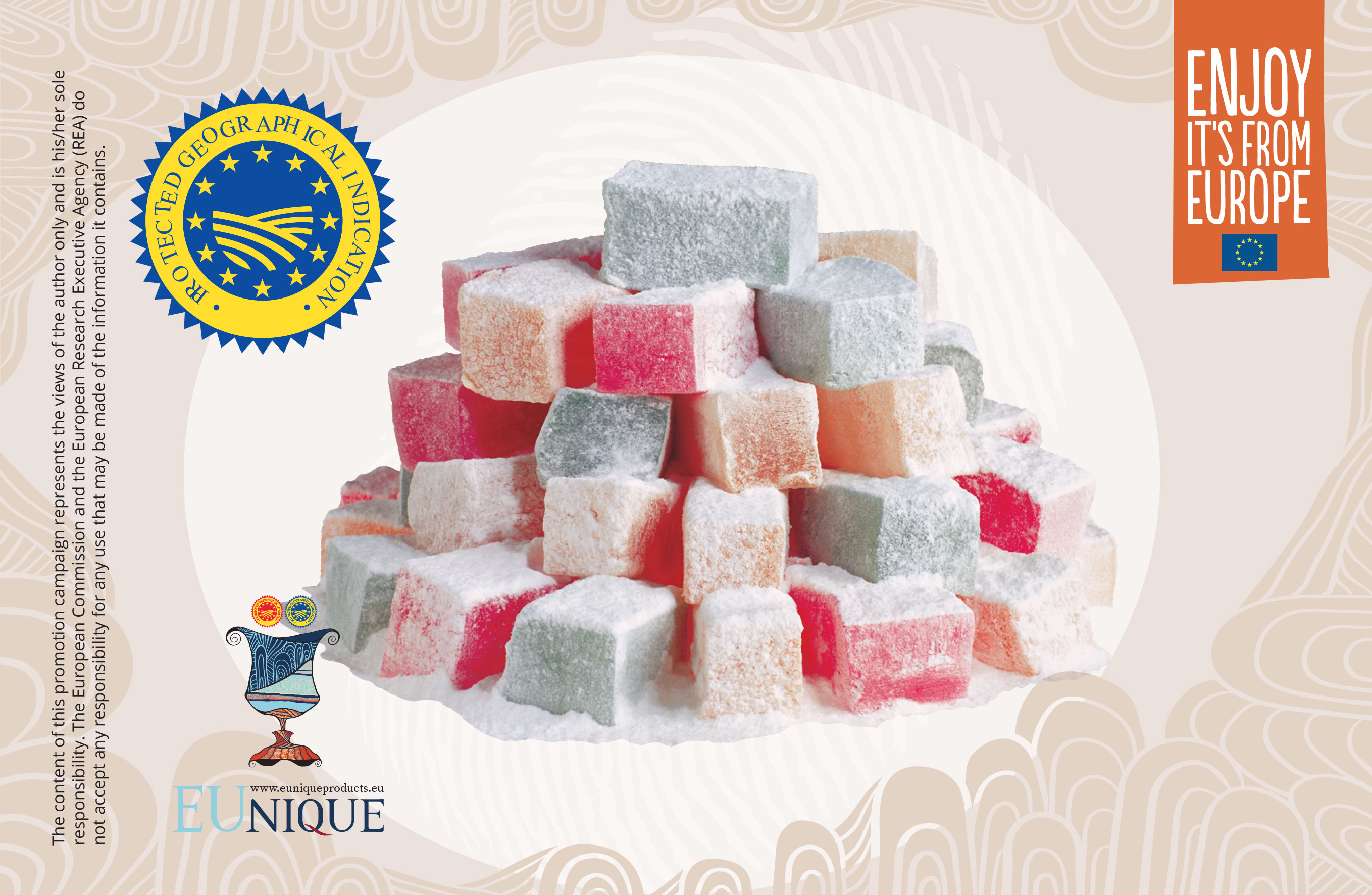 Loukoumi Geroskipou PGI is a delicious in a colourful variety of flavours, being produced in a small beautiful town on the southwest coast of Cyprus. This unique and delicious loukoumi is being cut into bite-sized cubes, which are dusted with caster sugar or finely flaked coconut.